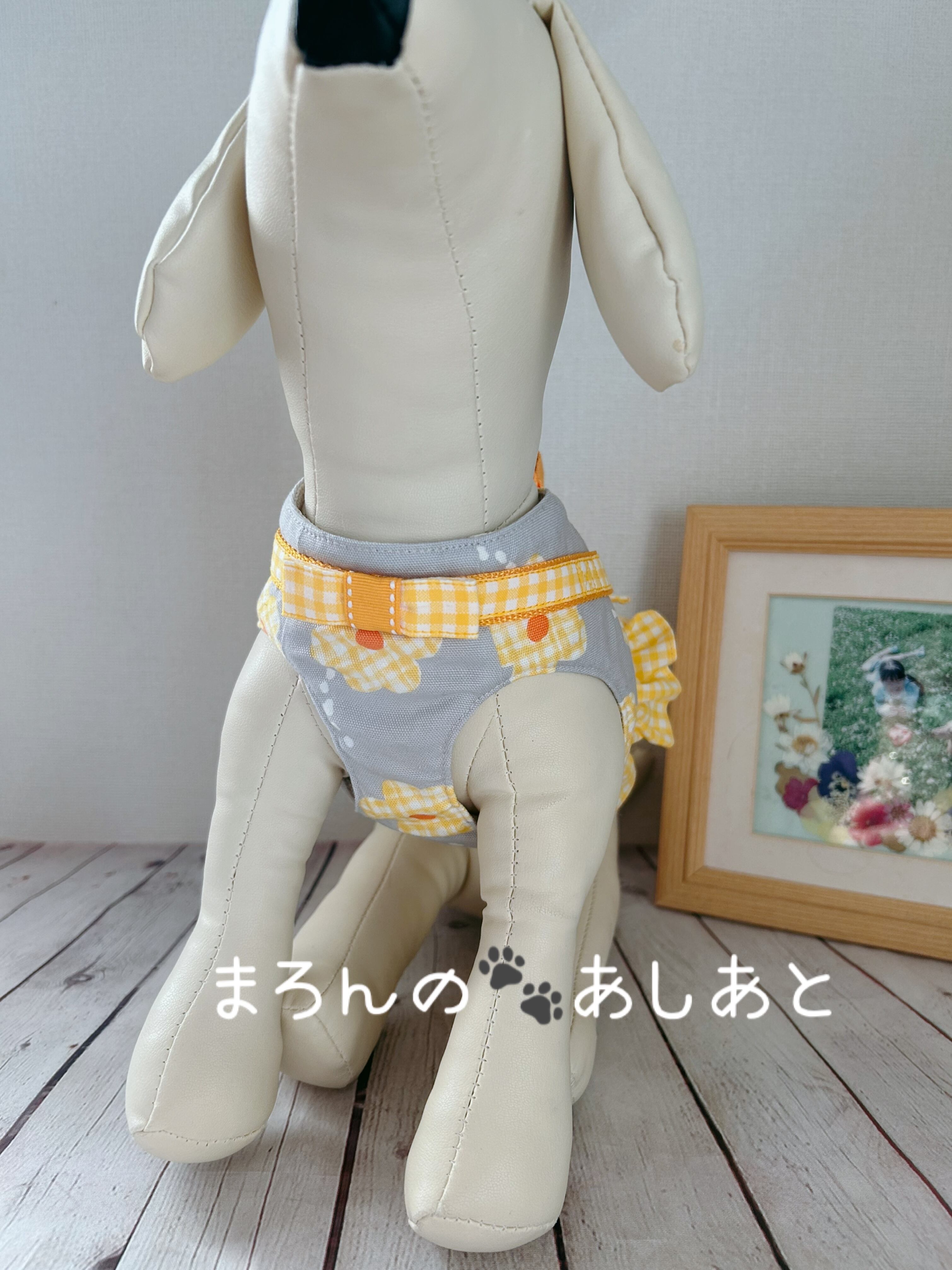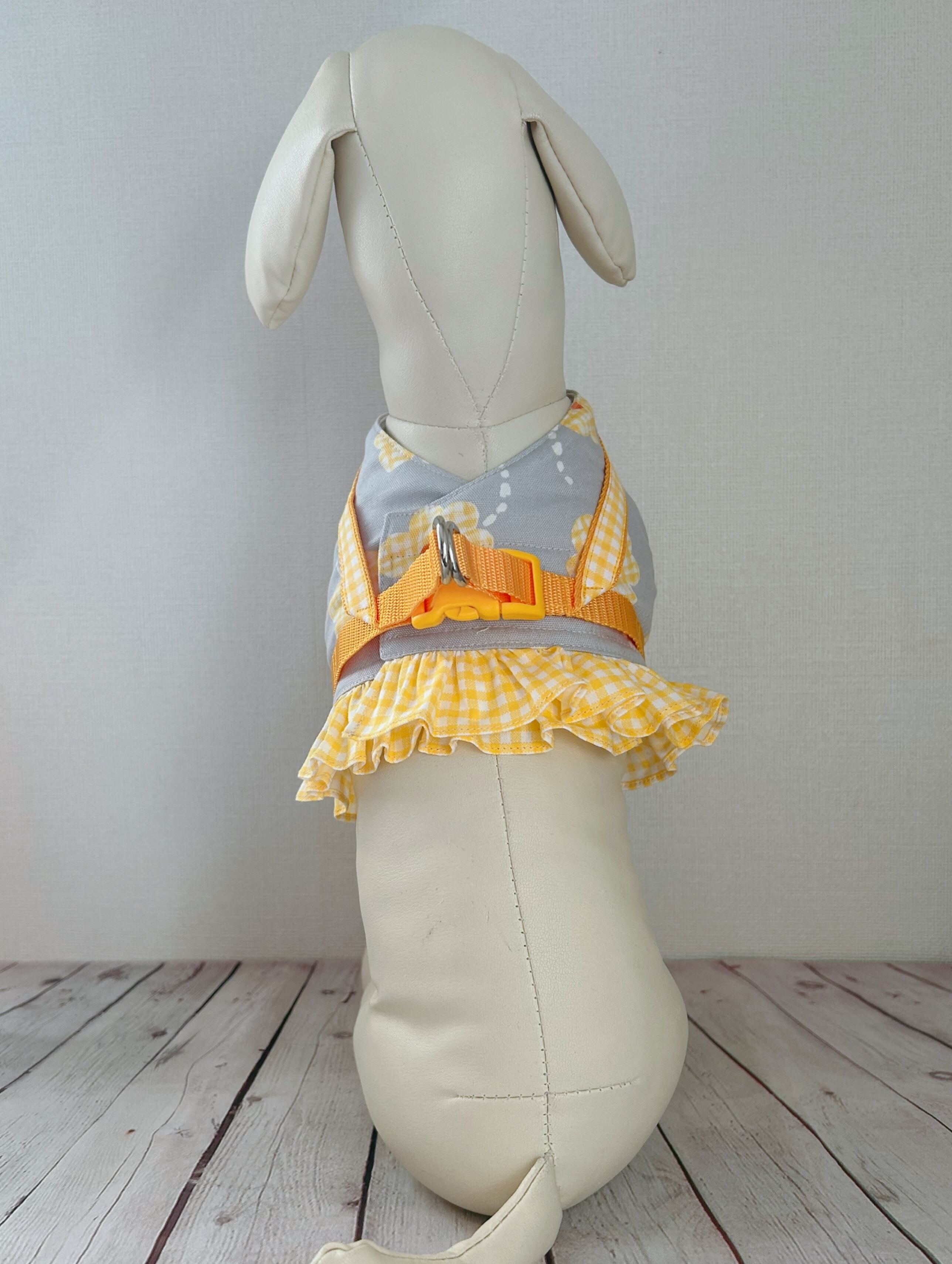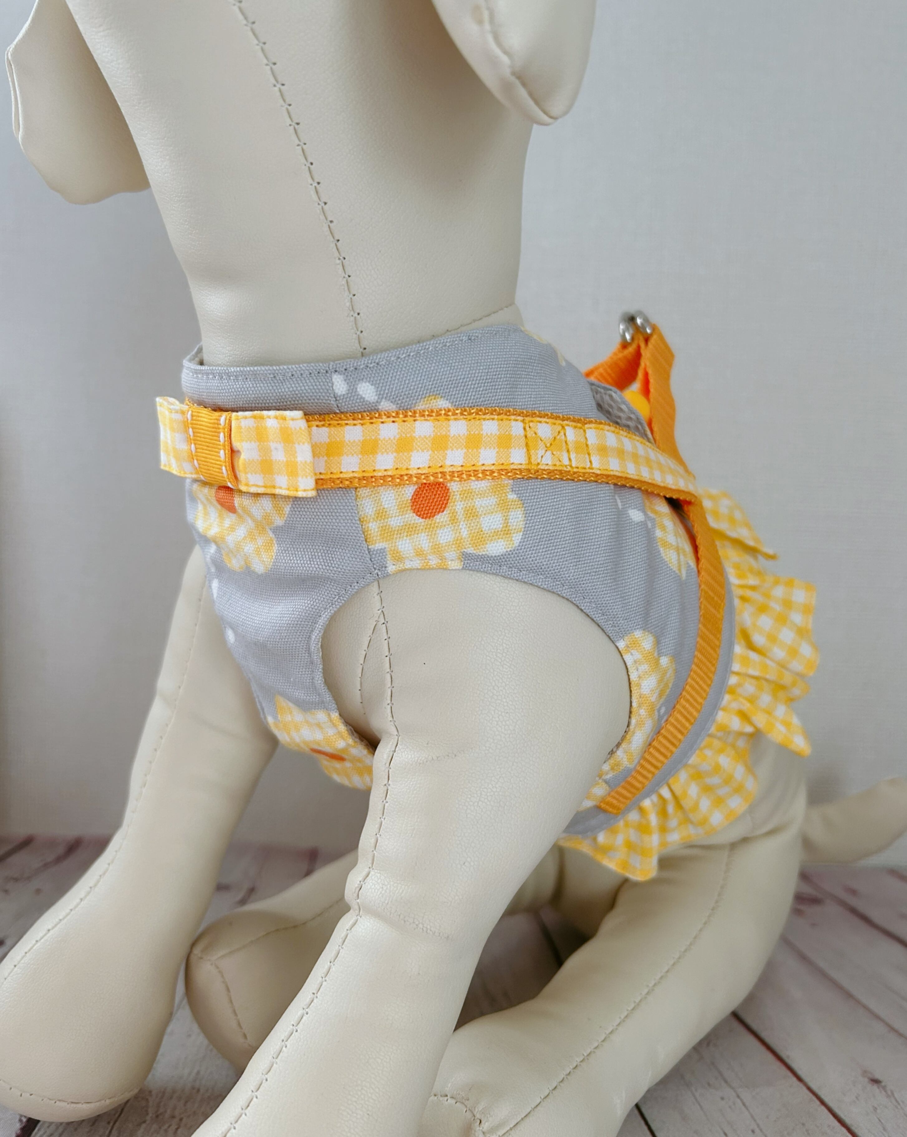 犬猫ハーネス イエローチェックフラワー 裾ミニフリル