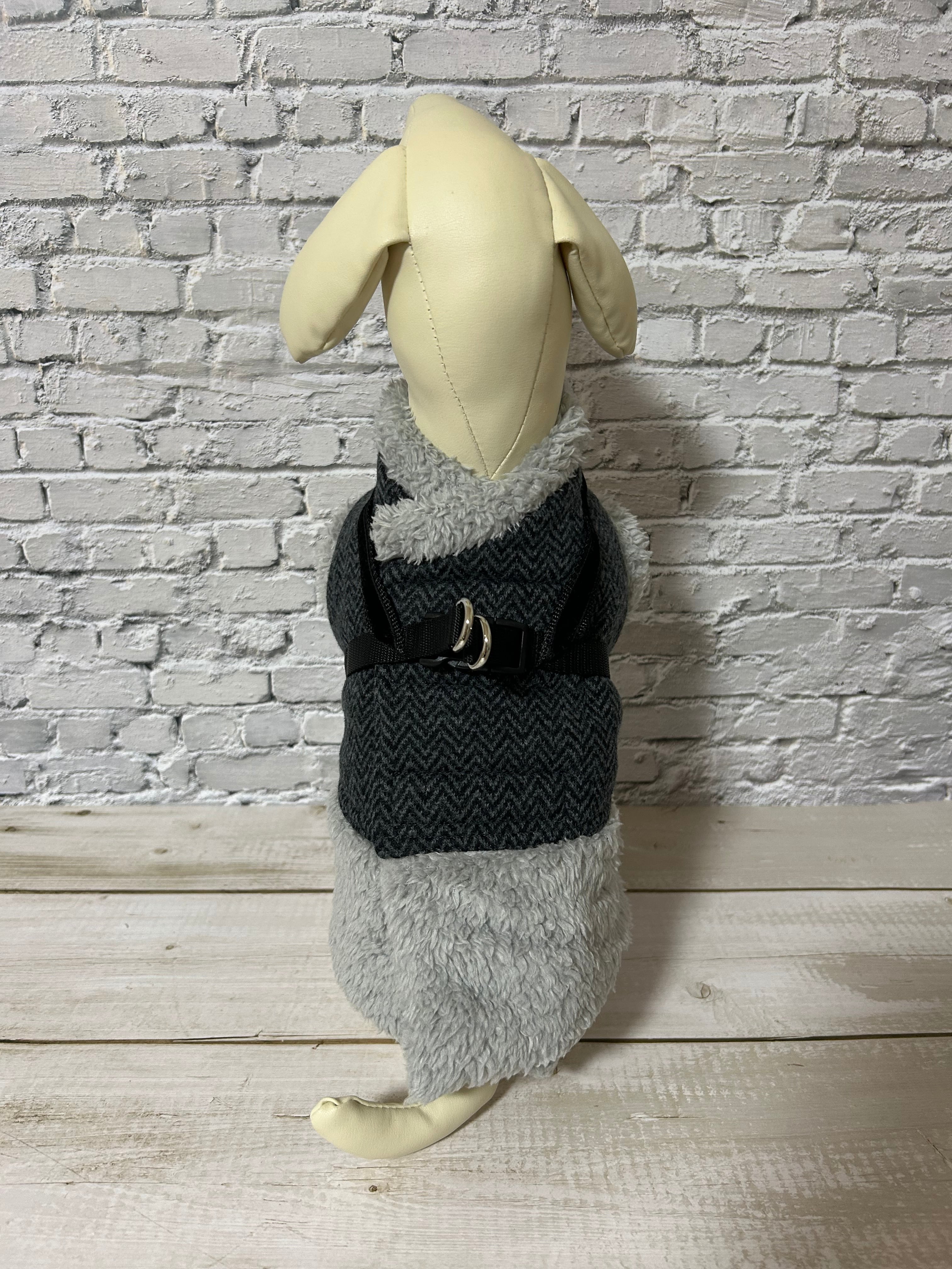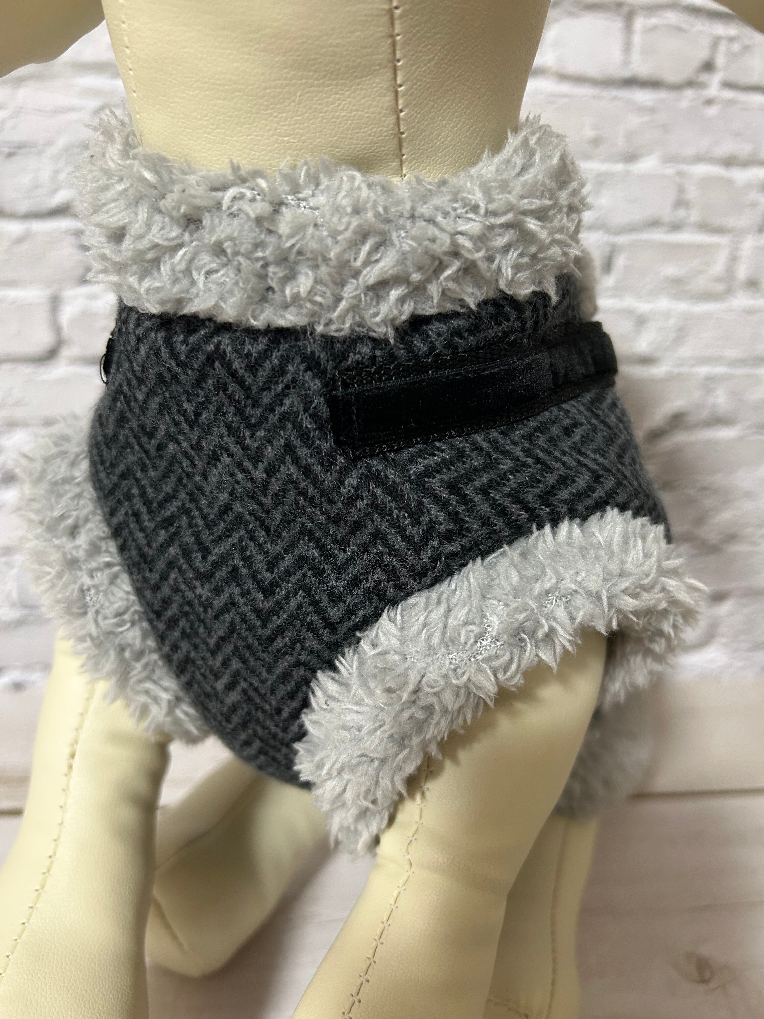 冬用 犬猫ハーネス ヘリンボーン×グレーファー あったかモコモコ襟・袖・裾付き 2点止め