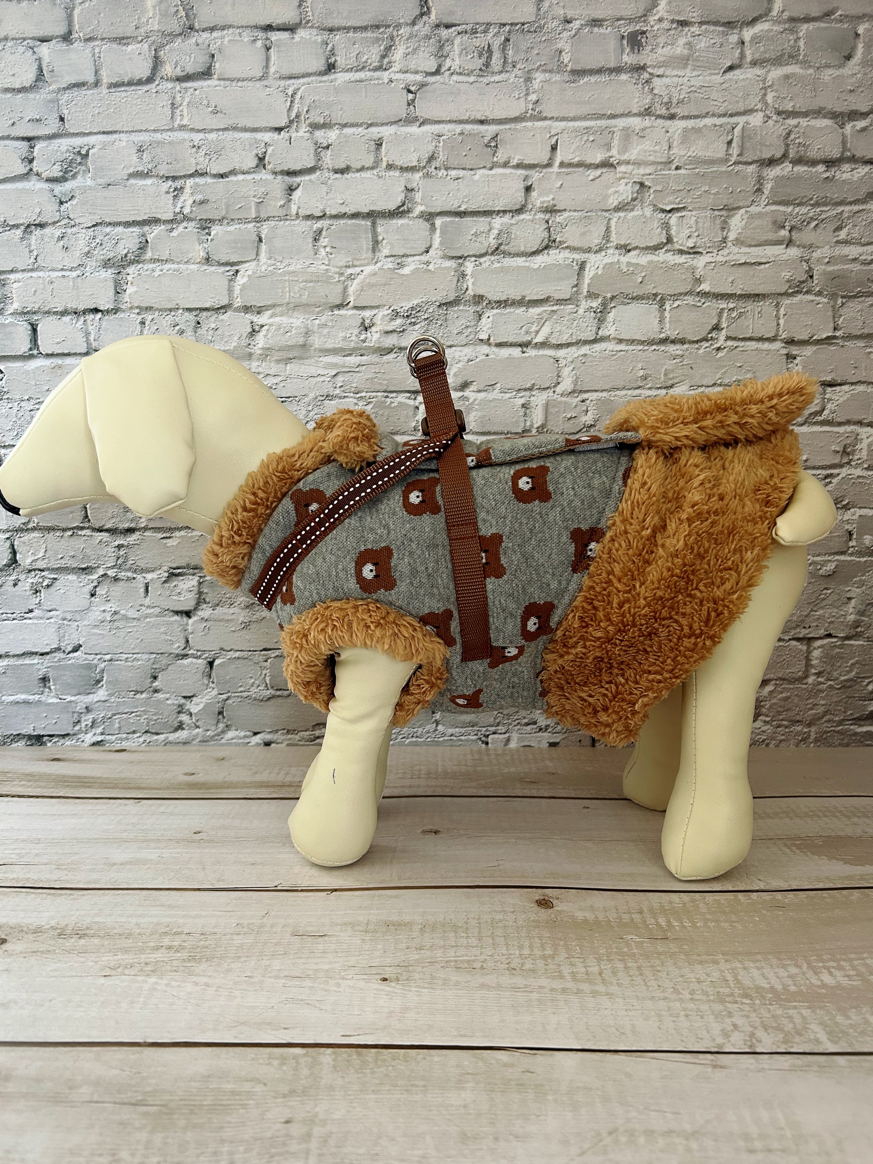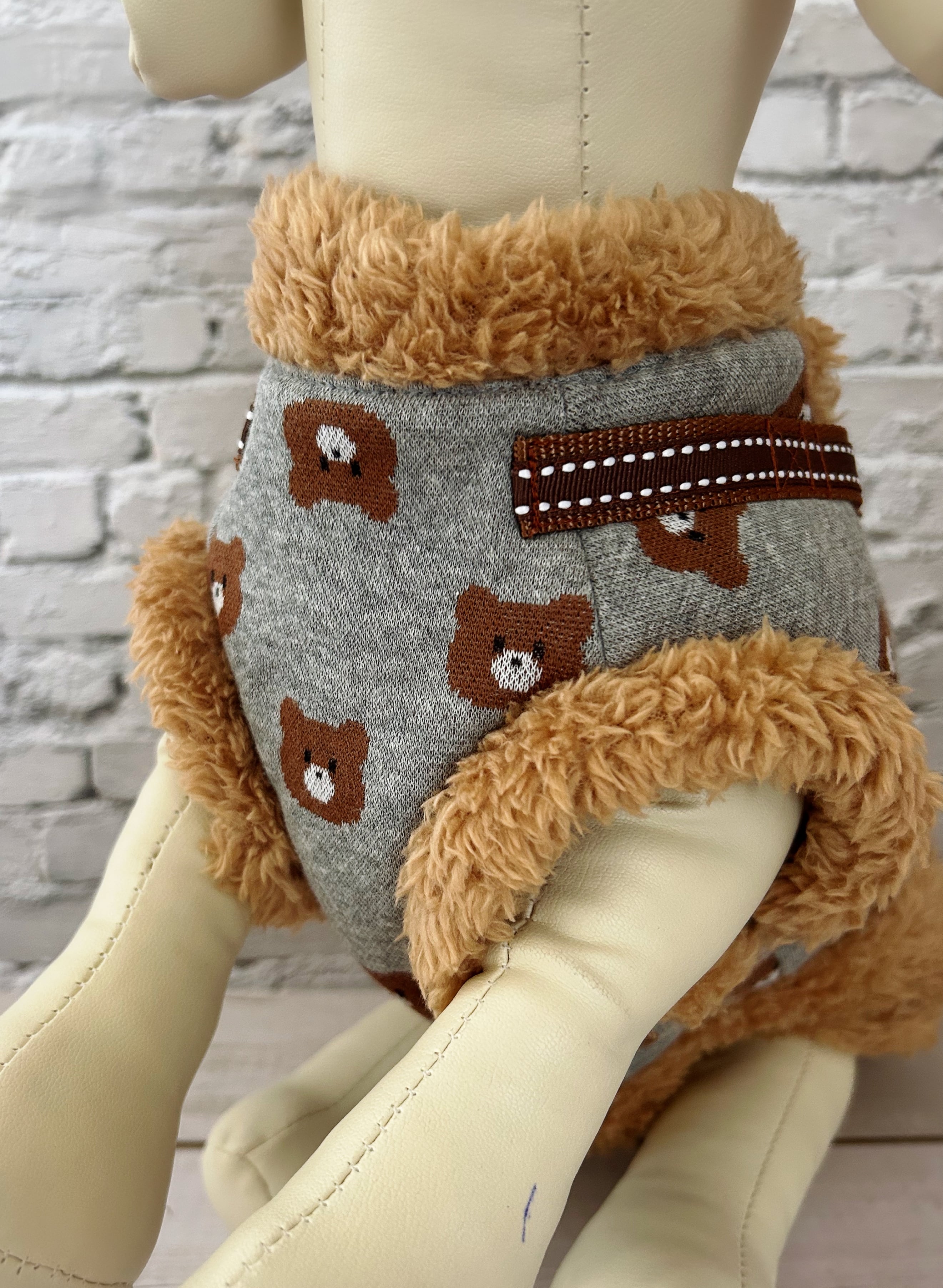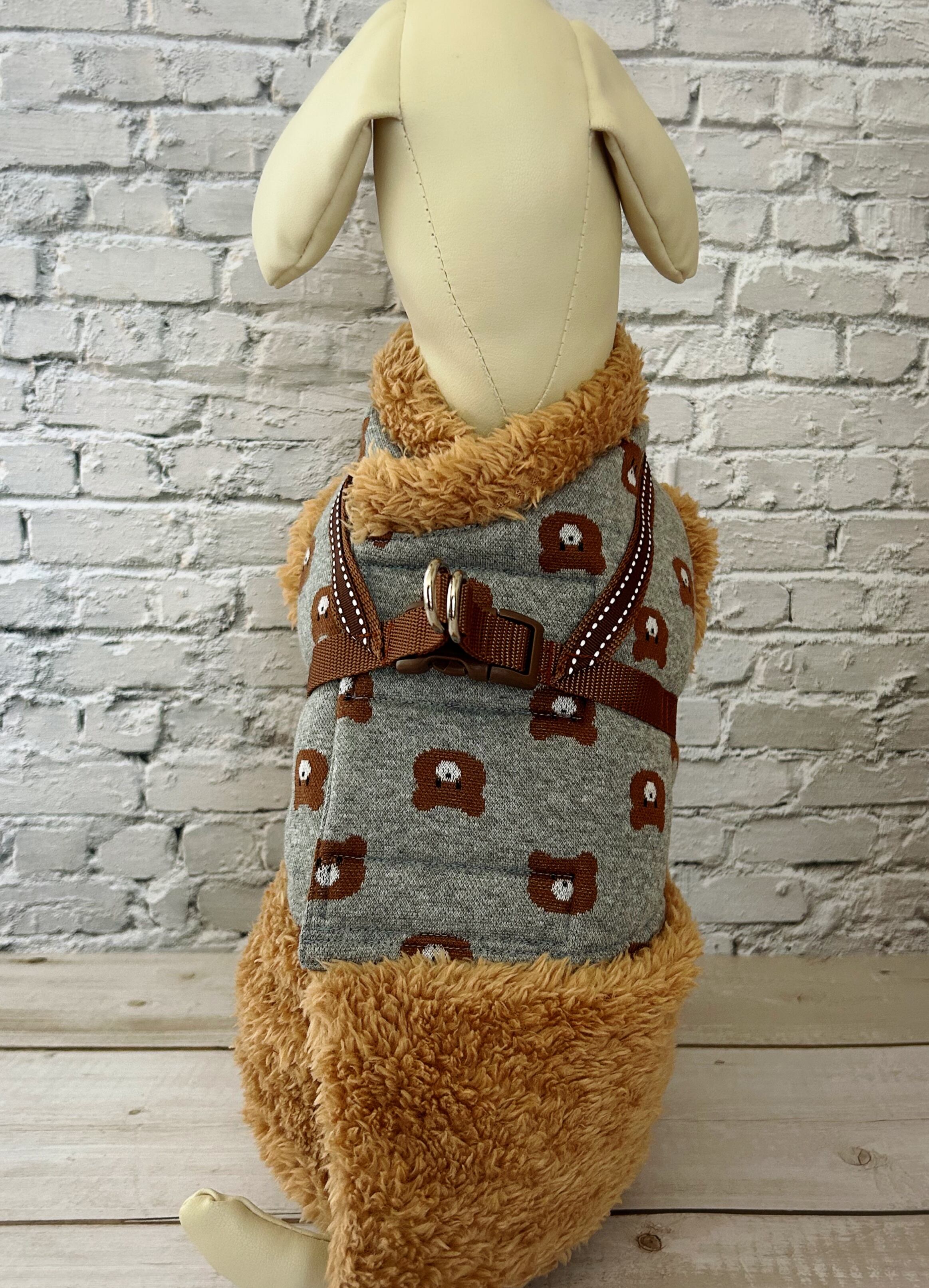 冬用 犬猫ハーネス くまちゃんジャガードニット×ブラウンファー あったかモコモコ襟・袖・裾付き 2点止め