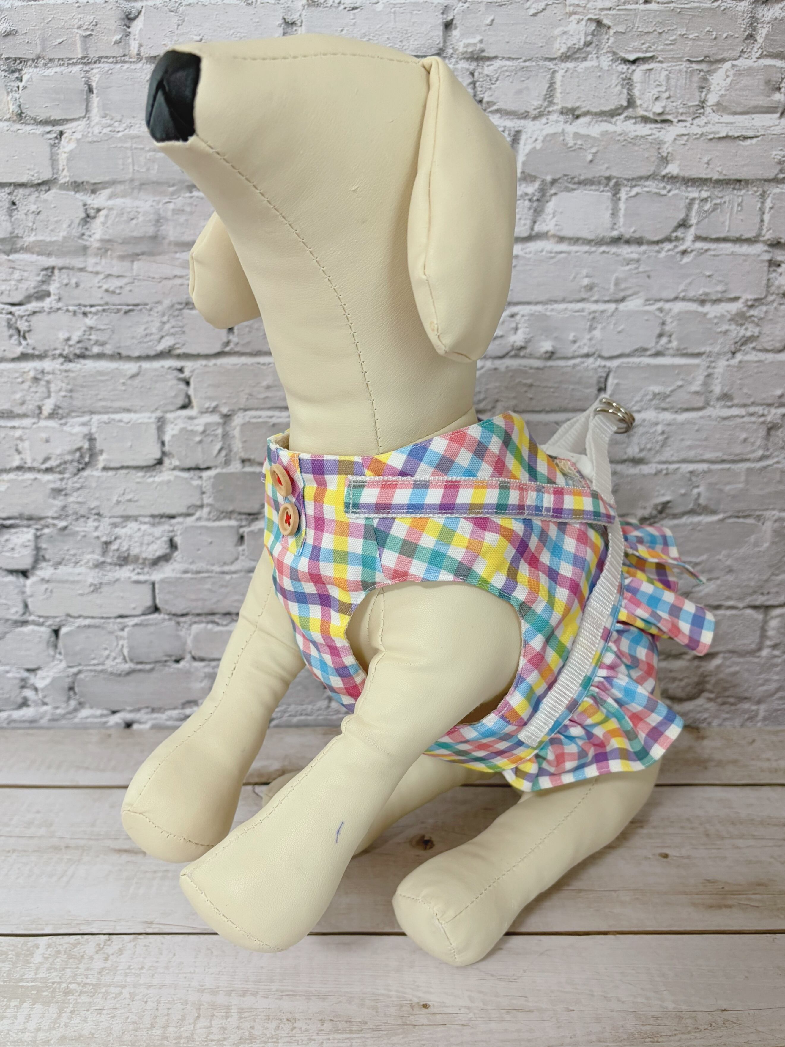 犬猫ハーネス カラフルチェック ウッドボタン 裾ミニフリル